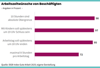 Dessen ungeachtet wird hierzulande in einem moralisierenden Ton ständig Mehrarbeit eingefordert – trotz eines hohen Arbeitsvolumens. Aus guten Gründen haben die Beschäftigten aber andere Interessen: Fast drei Viertel möchten nicht länger als 8 Stunden pro Tag arbeiten. Noch größer ist die Ablehnung von Arbeitszeiten, die sich bis spät in den Abend hinein erstrecken (siehe Grafik). Sie wissen offenbar besser, dass Arbeit ohne klare Grenzen sowohl die Vereinbarkeit von Familie und Beruf als auch ihre Gesundheit nachhaltig gefährdet.