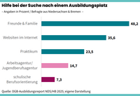 Probleme gibt es auch an anderen Stellen. In seinem kürzlich vorgestellten Ausbildungsreport für Niedersachsen und Bremen zeigt der DGB deutlich die Einstiegshürden auf. Der Zugang zur Ausbildung ist stark vom Familien- und Bekanntenkreis, Eigenrecherche und praktischen Erfahrungen geprägt. Beratungsleistungen der Agenturen und die Berufsorientierung in den Schulen spielen nur eine Nebenrolle als Hilfe bei der Suche nach dem richtigen Ausbildungsplatz (siehe Grafik). Dies liegt vor allem daran, dass die Angebote wenig bekannt sind oder im schulischen Bereich Defizite aufweisen.