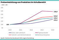 Denn Schule ist eine ziemlich teure Angelegenheit. Wie das Vergleichsportal Idealo erst kürzlich ermittelt hat, kostet ein durchschnittliches Schulleben in Deutschland von der Einschulung bis zum Abitur die Familien über 20.000 Euro. Hierbei schlagen nicht nur Klassenfahrten und technische Mittel zu Buche. Seit 2020 haben sich die Preise für Schreib- und Zeichenmaterial und Papierprodukte stärker als die allgemeine Inflation entwickelt (siehe Grafik). Für Schul- und Lehrbücher galt dies in den letzten Jahren zwar nicht, jedoch haben sie sich im Juni 2025 um 3,8 Prozent gegenüber dem Vorjahresmonat verteuert. Die Verbraucherpreise stiegen im selben Zeitraum um rund die Hälfte.