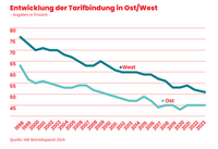 Das Dilemma: Seit Jahren ist die Tarifbindung in Deutschland rückläufig (siehe Grafik). Das liegt am Rückzug von Betrieben aus Arbeitgeberverbänden, aber auch an Arbeitgeberverbänden, die eine Mitgliedschaft ohne Tarifverpflichtung anbieten. Zudem fehlt im Bund, was in Sachsen-Anhalt schon Realität ist: Ein Tariftreuegesetz, das die Vergabe öffentlicher Mittel an einen Tarifvertrag bindet. Nur wenn wieder mehr Betriebe Tarifverträge haben, kann die Zukunft der Arbeitswelt gerechter gestaltet werden.