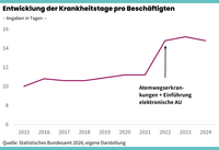 Wer zu einer solchen Schelte ausholt, sollte zumindest faktenbasiert agieren. Es stimmt zwar, dass es zuletzt eine Zunahme der Krankheitstage gegeben hat (siehe Grafik). Für den Anstieg gibt es laut Expertenkreisen jedoch eine simple Erklärung: Neben dem Anstieg von Atemwegserkrankungen wurde Anfang 2022 die elektronische Arbeitsunfähigkeitsbescheinigung (AU) eingeführt. Seitdem werden alle Krankschreibungen systematisch erfasst, eine Erfassungslücke schlichtweg geschlossen. Mitnichten lässt sich daraus ein Vorwurf gegen die Beschäftigten konstruieren.
