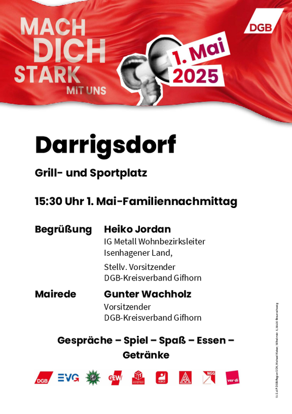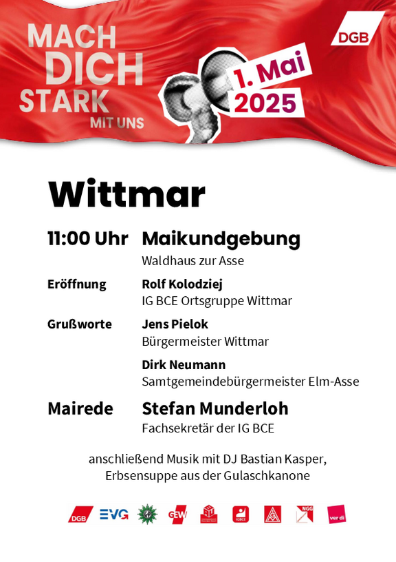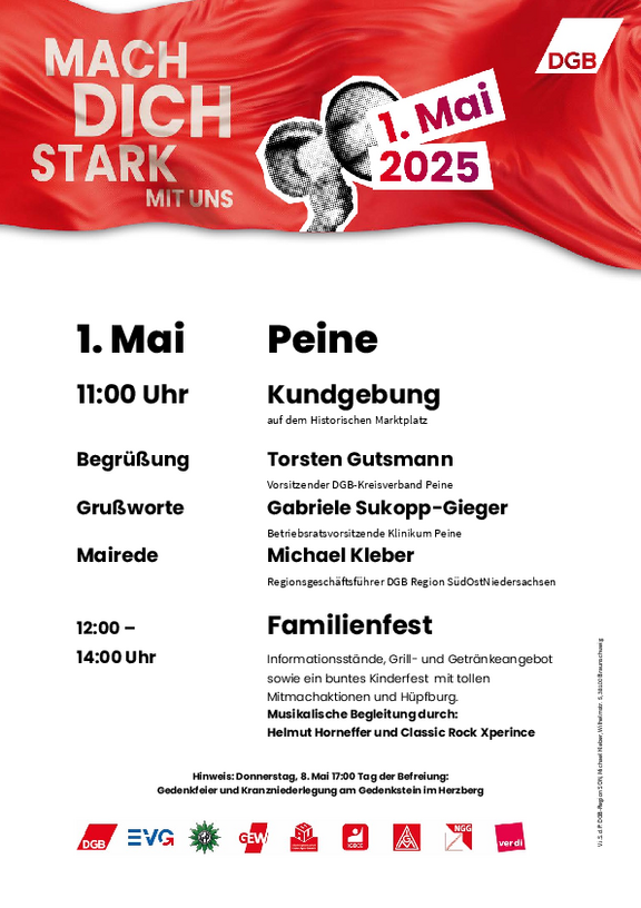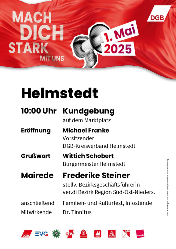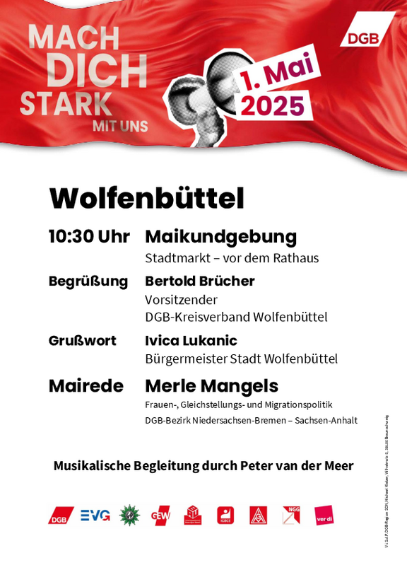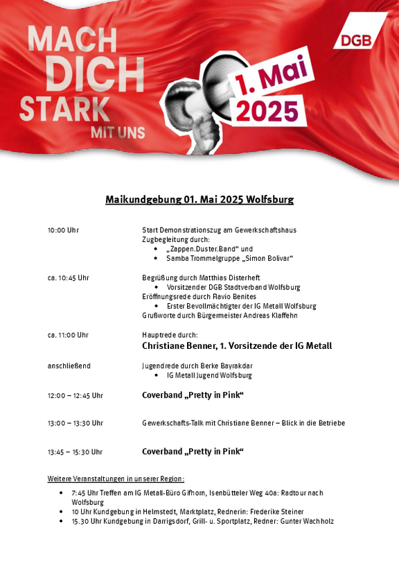 Kommt mit uns am Tag der Arbeit auf die Straße und macht euch stark für eine friedliche und gerechte Zukunft in Deutsch-land, Europa und der Welt! Gemeinsam können wir die Politik zum Handeln bringen und für Investitionen, Verteilungsgerechtigkeit, Tarifbindung, faire Arbeitszeiten, stabile Renten und eine starke Demokratie kämpfen.