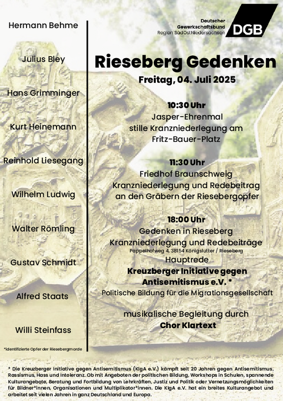 Die Gedenkveranstaltungen finden ihren Abschluss in Rieseberg am Denkmal für die Opfer auf dem Gelände der ehemaligen DGB Jugendbildungsstätte (Pappelhofweg 4, Königslutter/Rieseberg). Beginn ist hier 18:00 Uhr. Ein Vertreter der Kreuzberger Initiative gegen Antisemitismus e.V. hält die Gedenkrede. Die Veranstaltung wird musikalisch vom Chor „Klartext“ aus Braunschweig begleitet.