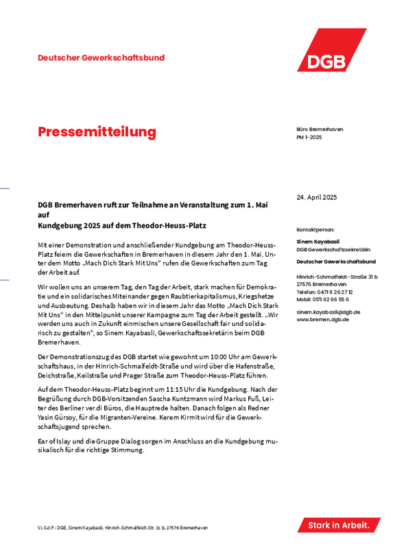 Wir wollen uns an unserem Tag, den Tag der Arbeit, stark machen für Demokratie und ein solidarisches Miteinander gegen Raubtierkapitalismus, Kriegshetze und Ausbeutung. Deshalb haben wir in diesem Jahr das Motto „Mach Dich Stark Mit Uns“ in den Mittelpunkt unserer Kampagne zum Tag der Arbeit gestellt. „Wir werden uns auch in Zukunft einmischen unsere Gesellschaft fair und solidarisch zu gestalten“, so Sinem Kayabasli, Gewerkschaftssekretärin beim DGB Bremerhaven.