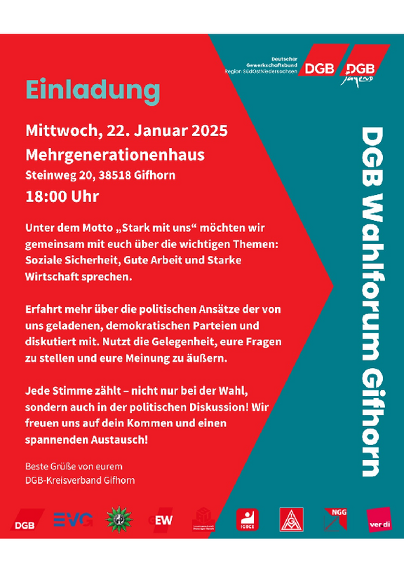 „Darum“ so Gunter Wachholz, Vorsitzender des DGB Kreisverbandes Gifhorn „Mach auch du dich stark mit uns und mach dein Kreuz für gute Arbeit, eine starke Wirtschaft und soziale Sicherheit. Mach dich stark mit uns für einen handlungsfähigen Staat, der niemanden zurücklässt. Deine Stimme kann den Unter-schied machen. Hör genau hin, welche Partei dich zukünftig vertreten soll, triff deine Wahl und gestalte die Zukunft mit!“