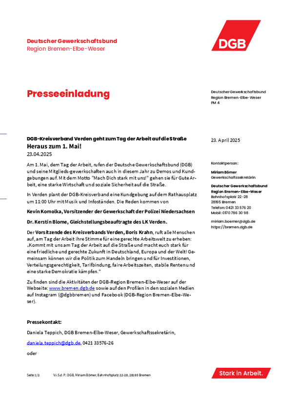Der Vorsitzende des Kreisverbands Verden, Boris Krahn, ruft alle Menschen auf, am Tag der Arbeit ihre Stimme für eine gerechte Arbeitswelt zu erheben: „Kommt mit uns am Tag der Arbeit auf die Straße und macht euch stark für eine friedliche und gerechte Zukunft in Deutschland, Europa und der Welt! Gemeinsam können wir die Politik zum Handeln bringen und für Investitionen, Verteilungsgerechtigkeit, Tarifbindung, faire Arbeitszeiten, stabile Renten und eine starke Demokratie kämpfen.“