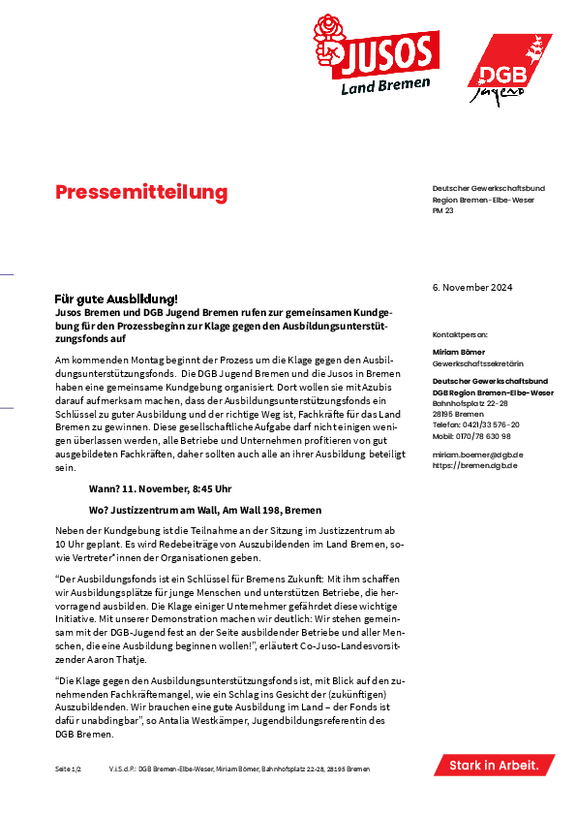 “Der Ausbildungsfonds ist ein Schlüssel für Bremens Zukunft: Mit ihm schaffen wir Ausbildungsplätze für junge Menschen und unterstützen Betriebe, die her-vorragend ausbilden. Die Klage einiger Unternehmer gefährdet diese wichtige Initiative. Mit unserer Demonstration machen wir deutlich: Wir stehen gemein-sam mit der DGB-Jugend fest an der Seite ausbildender Betriebe und aller Menschen, die eine Ausbildung beginnen wollen!”, erläutert Co-Juso-Landesvorsitzender Aaron Thatje.