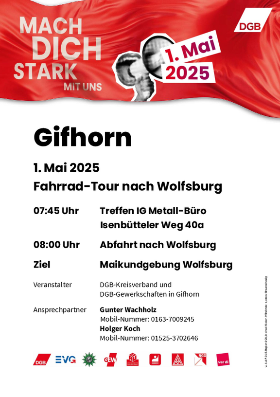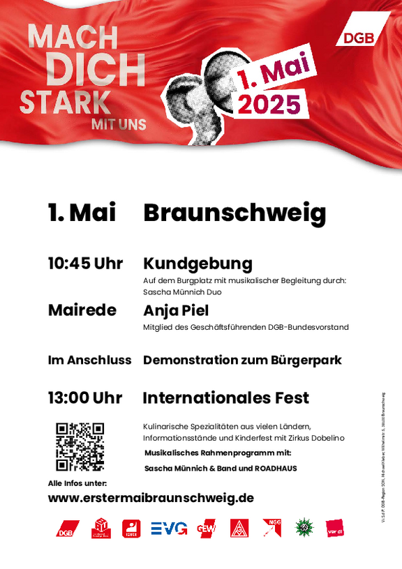 Kommt mit uns am Tag der Arbeit auf die Straße und macht euch stark für eine friedliche und gerechte Zukunft in Deutschland, Europa und der Welt! Gemeinsam können wir die Politik zum Handeln bringen und für Investitionen, Verteilungsgerechtigkeit, Tarifbindung, faire Arbeitszeiten, stabile Renten und eine starke Demokratie kämpfen.