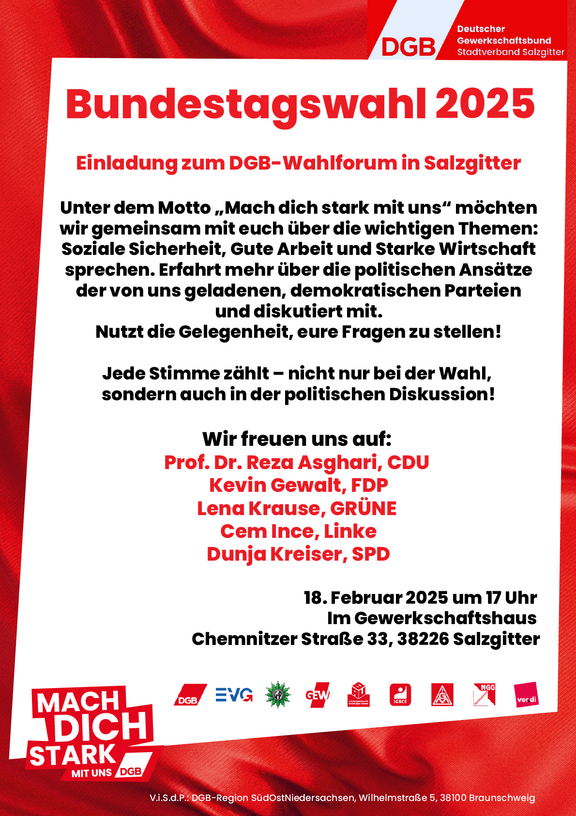Denise Steinert, Gewerkschaftssekretärin der DGB-Region SüdOstNiedersachsen, ergänzt: „Deine Stimme kann den Unterschied machen. Hör genau hin, welche Partei dich zukünftig vertreten soll, triff deine Wahl und gestalte die Zukunft mit!“