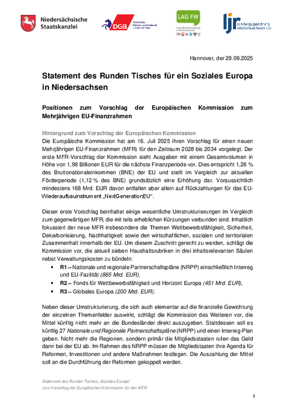Der Kommissionsvorschlag sieht eine grundlegende Umstrukturierung der EU-Fördermittel vor. Insbesondere die geplante Mittelvergabe über nationale Partnerschaftspläne und die Reduzierung der Mittel für den Europäischen Sozialfonds Plus (ESF+) stoßen in Niedersachsen auf Kritik. Es wird befürchtet, besonders EU-geförderte Projekte mit dem Ziel der sozialen Gerechtigkeit, Gleichberechtigung und Guter Arbeit in Europa könnten von den Kürzungen betroffen sein. Die Mitglieder des Runden Tisches fordern hingegen ausdrücklich, die soziale Dimension der EU-Förderung zu stärken und die bewährten Mitbestimmungsstrukturen auf regionaler Ebene zu erhalten.