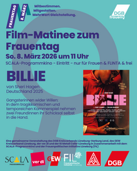 Anlässlich des Internationalen Frauentages zeigen der DGB Kreisverband Lüneburg-Harburg Land, der GEW Kreisverband Lüneburg, ver.di und der IG Metall Celle-Lüneburg in Zusammenarbeit mit dem SCALA-Programmkino und der Frauenpolitischen Initiative Lüneburg (FIL) den Film “Billie” von Sheri Hagen.